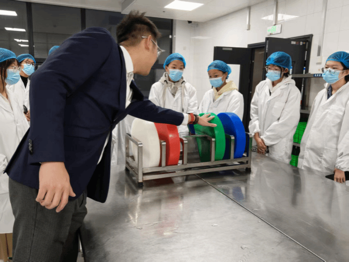 在后勤保障部副部长韩睿老师的引导下,同学们依次参观了食材存储、清洗、加工及烹饪等区域。整个后厨环境整洁,流程井然有序。最令人印象深刻的是严格的食材分类处理规范,通过不同颜色的菜板来区分用途:绿色用于蔬菜,红色用于生肉,蓝色用于水产品,白色用于熟食,这一举措有效避免了交叉污染,筑牢了食品安全防线。让同学们更加动容的是,为了让学生在清晨就能吃上新鲜早餐,师傅们每天凌晨4点就已到岗,现场手工制作香喷喷的馒头包子花卷和酥脆的油条。随后,韩睿老师向大家介绍了食堂的消防安全系统,从消防器材的配置到员工的定期演练,全面保障师生的生命安全。在食品抽检环节,韩睿老师特别强调,每批次食材的抽检不仅检测项目严格,其取样重量与检测时间也有明确规范,确保每一份数据真实可靠。