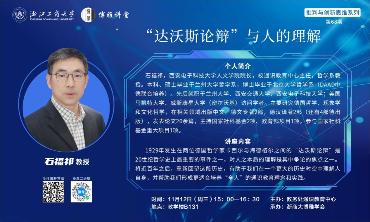 (通讯员 齐欣)受浙江工商大学教务处邀请,永利yl23411院长、通识教育中心主任石福祁于11月12日在该校开展通识教育和美育工作调研交流,并做客该校通识教育中心主办的博雅讲堂,做题为“达沃斯论辩与人的理解”学术报告。