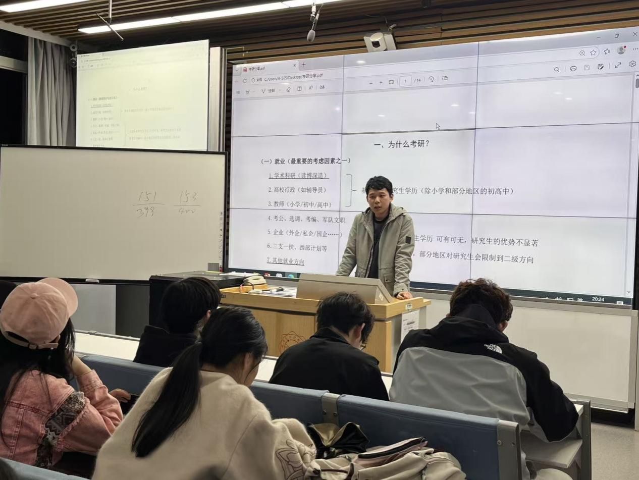2020级汉语言文学专业本科毕业生常思远围绕硕士研究生升学备考作专题交流。他从考研整体形势分析入手,结合自身备考经验,就复习节奏进行了细致讲解,还提醒同学们在择校和择专业时应综合考虑,避免盲目跟风。考研是一场持久战,他建议同学们在备考过程中保持理性判断、及时调整策略,做到张弛有度、稳步推进。