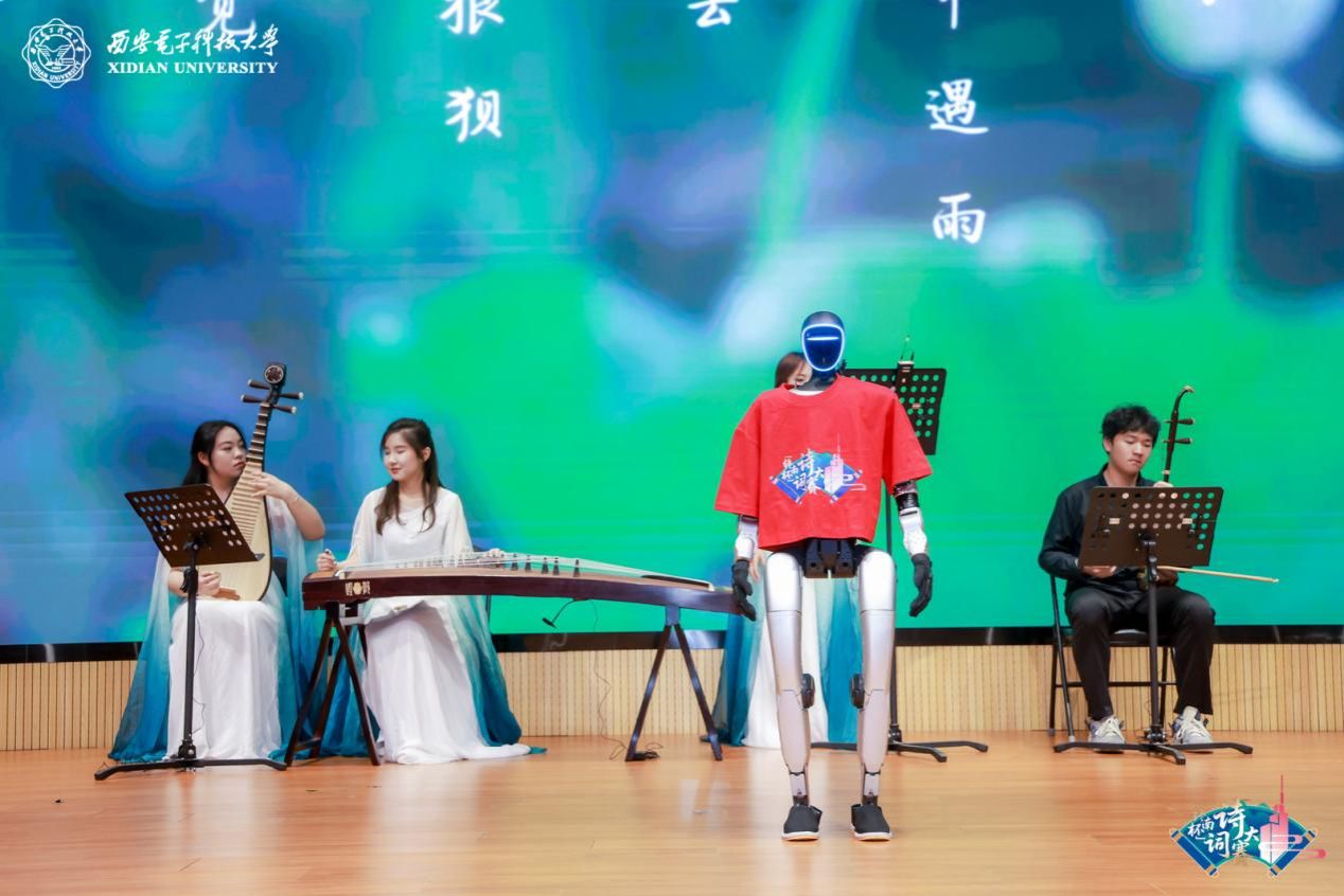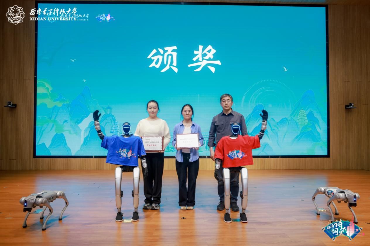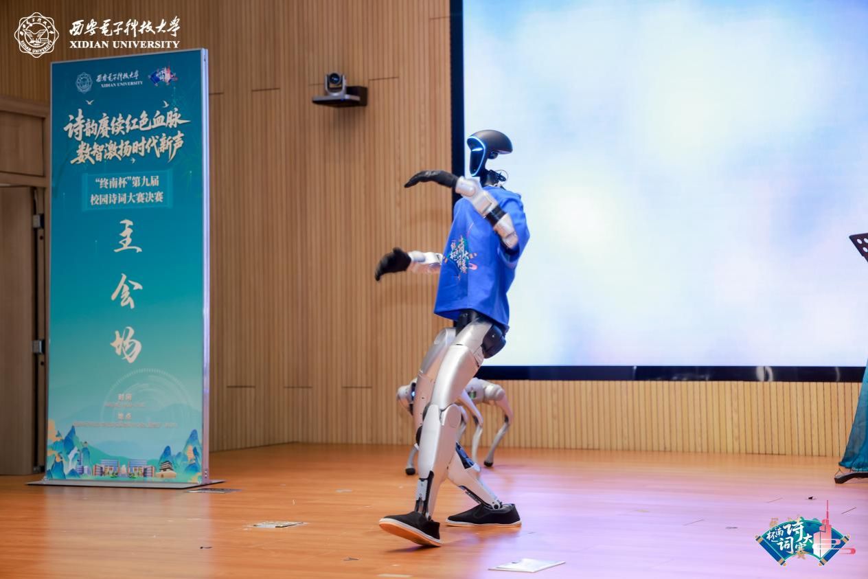 本届大赛成功实现科技与文化的跨界交融,打造出一场兼具沉浸感与趣味性的诗词盛宴。智能机器人“终南”“采薇”首次惊艳亮相。“终南”以开场主持身份从容控场,串联流程、点亮开篇;“采薇”则与人文学子联袂献演乐舞《定风波》,让古典神韵在科技赋能下焕发新生。赛间,两位机器人还与选手及观众展开多轮妙趣横生的诗词互动,成为调节赛程节奏、引爆全场热情的鲜活纽带。