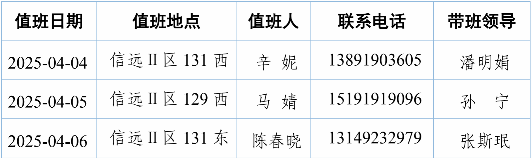 按照学校《关于2025年清明节放假时间安排的通知》要求,现将学院2025年清明节假期值班安排如下:
