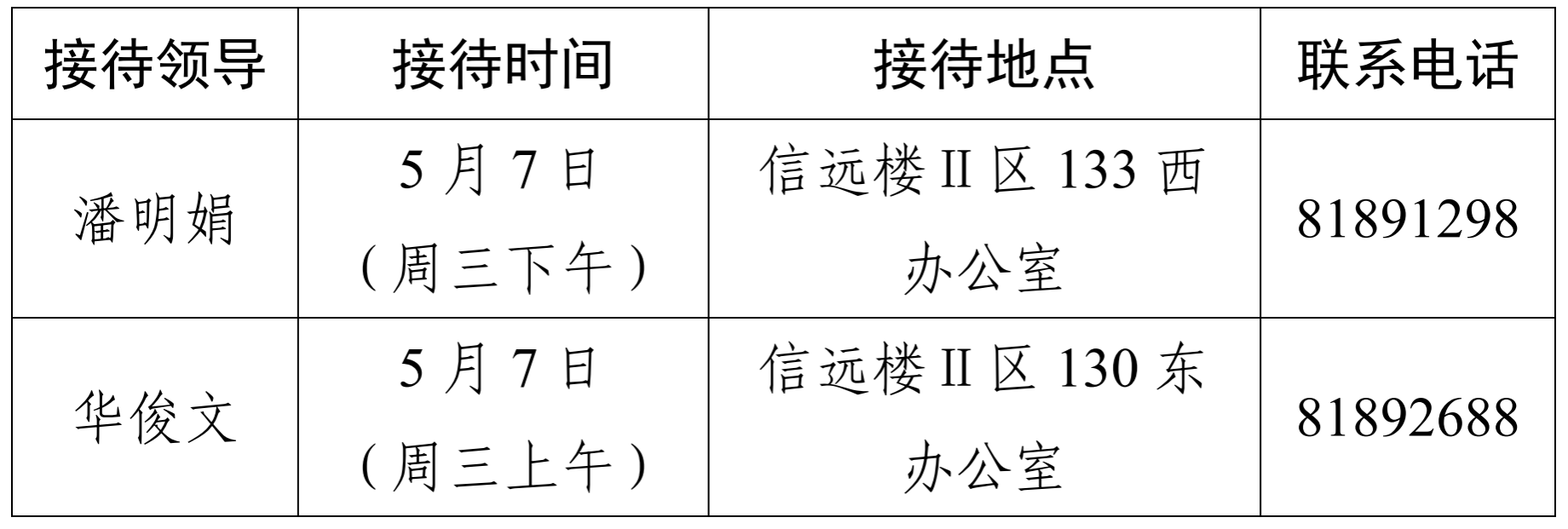 注:学院领导班子接待日主要受理的事项:1.学院人才培养、教学科研、学科建设、教师发展、对外交流、学生管理和服务保障等方面存在的问题与建议;2.反映有关学院重要决策和重要工作事宜的问题;3.涉及师生员工利益的申诉和诉求;4.亟须学院处理的难点问题;5.其他方面的建议和意见。