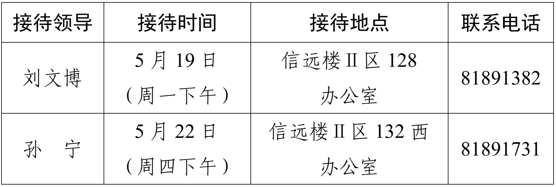 注:学院领导班子接待日主要受理的事项:1.学院人才培养、教学科研、学科建设、教师发展、对外交流、学生管理和服务保障等方面存在的问题与建议;2.反映有关学院重要决策和重要工作事宜的问题;3.涉及师生员工利益的申诉和诉求;4.亟须学院处理的难点问题;5.其他方面的建议和意见。