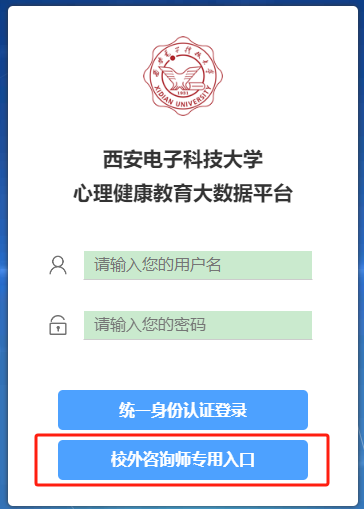 学生登录时,直接输入用户名及密码后,选择“校外咨询师专用入口”。用户名是考生准考证编号,密码位身份证后6位,如最后一位是字母,请用数字“9”代替字母。