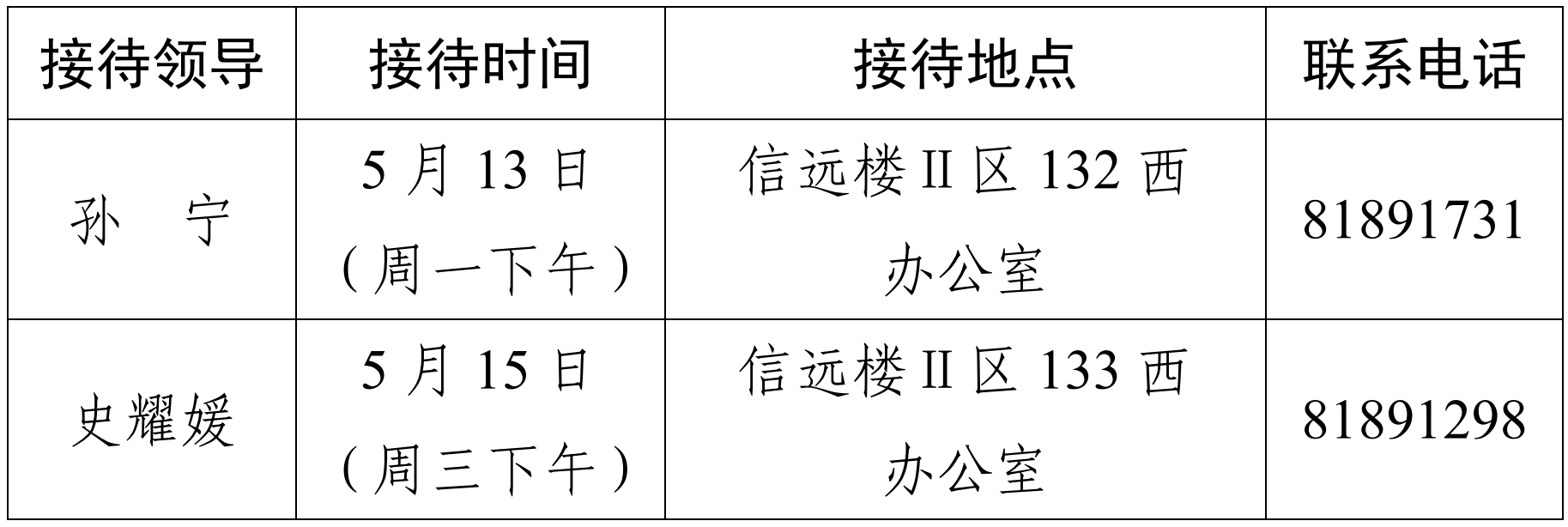 注:学院领导班子接待日主要受理的事项:1.学院人才培养、教学科研、学科建设、教师发展、对外交流、学生管理和服务保障等方面存在的问题与建议;2.反映有关学院重要决策和重要工作事宜的问题;3.涉及师生员工利益的申诉和诉求;4.亟须学院处理的难点问题;5.其他方面的建议和意见。