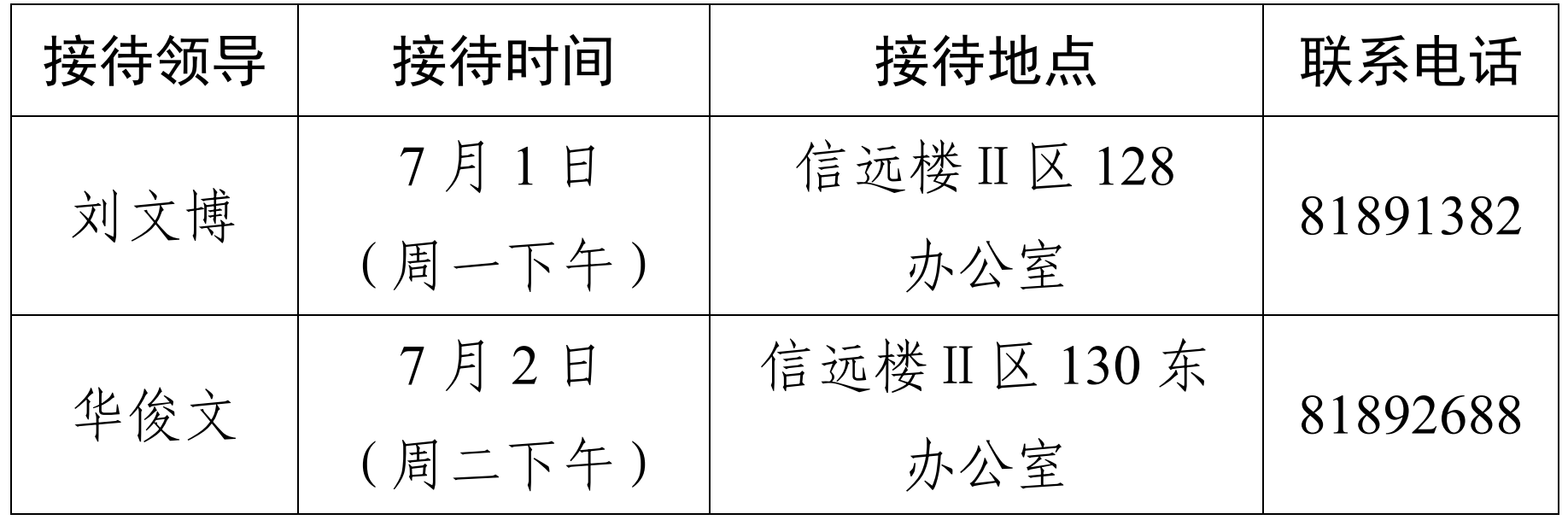 注:学院领导班子接待日主要受理的事项:1.学院人才培养、教学科研、学科建设、教师发展、对外交流、学生管理和服务保障等方面存在的问题与建议;2.反映有关学院重要决策和重要工作事宜的问题;3.涉及师生员工利益的申诉和诉求;4.亟须学院处理的难点问题;5.其他方面的建议和意见。