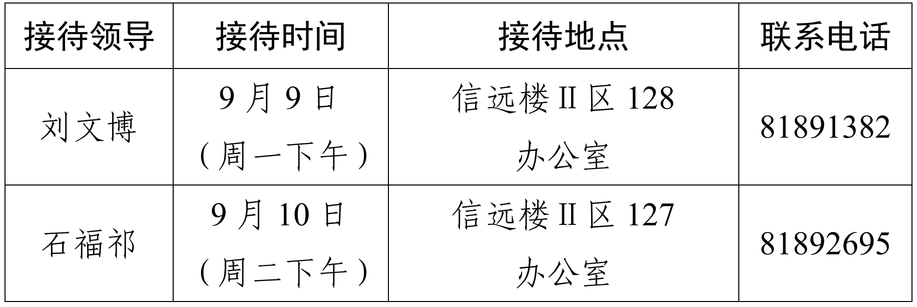 注:学院领导班子接待日主要受理的事项:1.学院人才培养、教学科研、学科建设、教师发展、对外交流、学生管理和服务保障等方面存在的问题与建议;2.反映有关学院重要决策和重要工作事宜的问题;3.涉及师生员工利益的申诉和诉求;4.亟须学院处理的难点问题;5.其他方面的建议和意见。