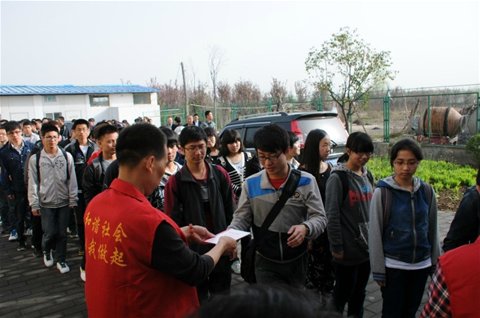 书院学院进入教室前,排队领取儒家经典《弟子规》