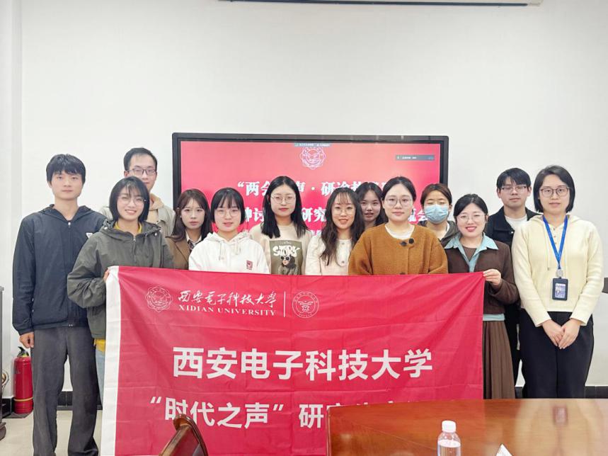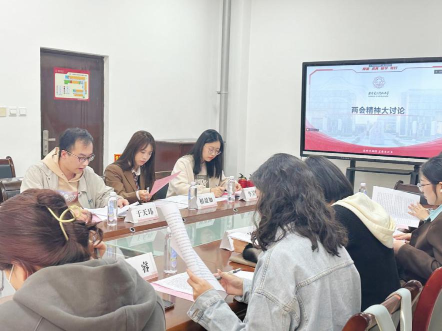 会议上半场,“时代之声”研究生宣讲团团长吴娜领学全国两会精神视频及《政府工作报告》。宣讲团成员高原阐释了个人对新质生产力的深刻理解,他提出科技革命是以提升和解放生产力为标志的,思想的进步也是一样的,高校宣讲团的发展需要以提升认知、解放思想为落脚点,坚持正确的工作方法,勇于打破思维定势和路径依赖,做到求真务实、敢做善为。宣讲团成员于天玮以传统制造业企业发展历程为例阐释发展新质生产力对推动社会发展跃升的重要作用。他认为研究生应当树立高远志向,形成正确的就业观,在就业择业方面坚定自身定位,实现自我发展与祖国发展的统一。“时代之声”研究生宣讲团成员薛睿、李昊洁、相盈如、卜思捷、高瑞璇、许泽文以及西安交通大学学生微宣讲团王惠莹也围绕两会精神相关内容进行积极讨论。