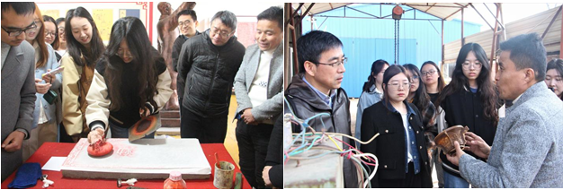 挂牌结束后,大家跟随岐山青铜器复仿技艺省级传承人于安君学习拓印技术。于安君为大家详细讲解并演示了碑刻拓印的整个过程。讲解结束后,老师和同学们也亲手感受了拓印技术,并共同完成了一幅拓印作品。稍后同学们又跟随于安君来到青铜器复制仿制技艺工坊,了解了青铜器复仿工艺。