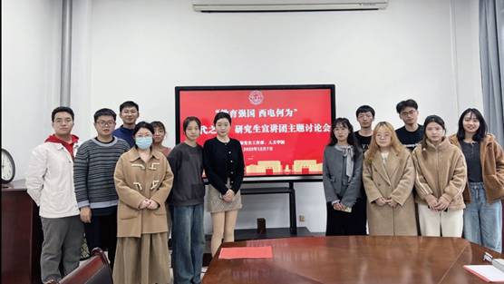 12月7日下午,“时代之声”研究生宣讲团于信远Ⅱ区135组织大讨论,党委副书记史耀媛、辅导员郭晓红及“时代之声”研究生宣讲团成员代表参会。会议结合“八个西电”的发展目标,围绕“如何在建设‘红色西电’中发挥青年宣讲力量”“强国有我,西电青年的责任与担当”“如何将理论宣讲与西电红色基因相融合,筑教育强国梦”等主题开展讨论。